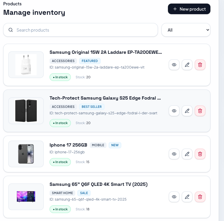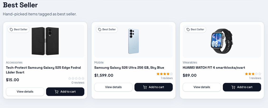 Dynamic Categories: The ability to organize products into specific categories (Mobile, PC, Gaming, etc.) and apply promotional "badges" such as Sale, Best Seller, New, or Trending.