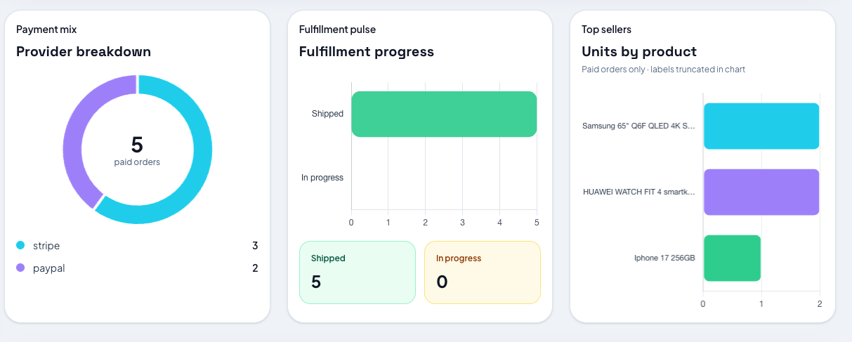 The project goes beyond a simple shopping cart by implementing a complete professional fulfillment cycle: